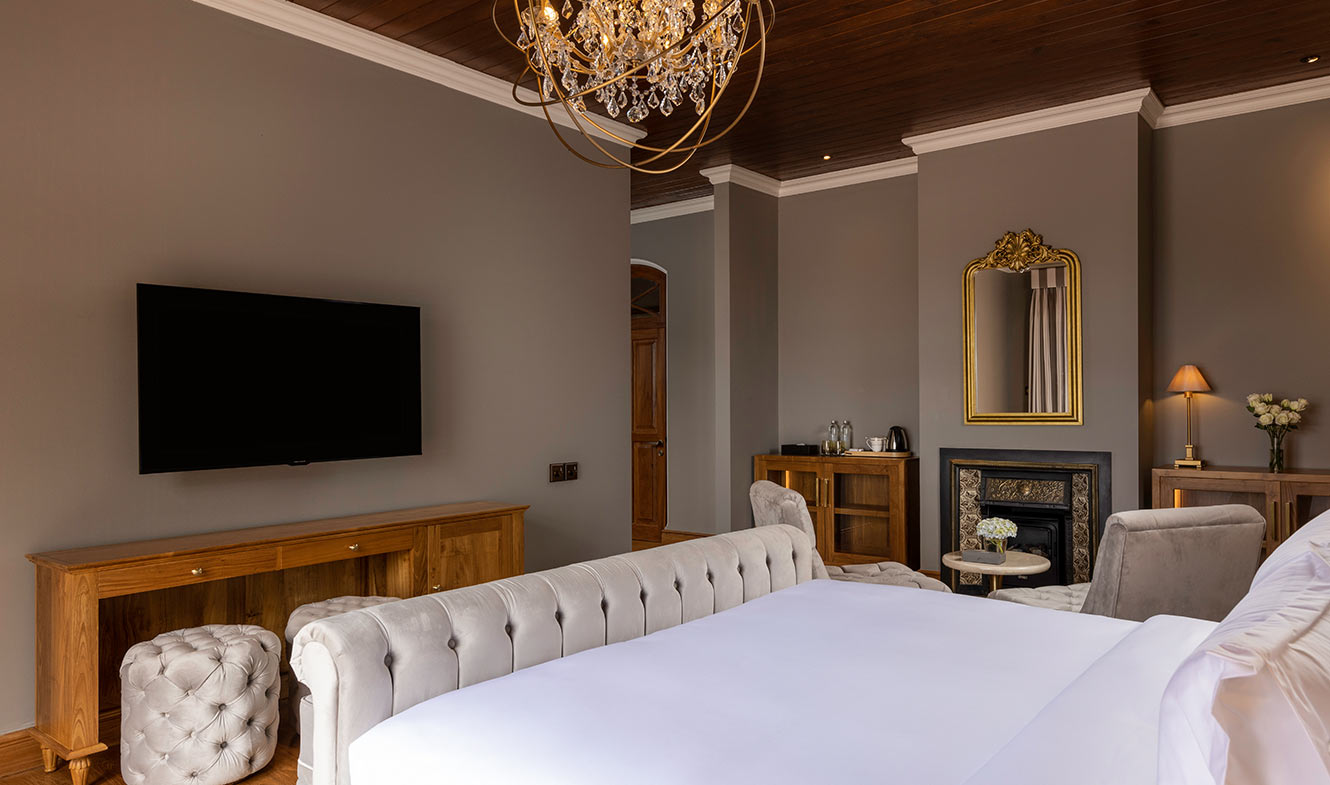 This romantic and elegant sanctuary in the hills exudes an ambiance of effortless sophistication. You will enjoy the cosy comfort of a plush king-size bed set before a panoramic window that offers stunning views of the surrounding mountain region when you stay at a Luxury Suite at The Bellwood Manor.
